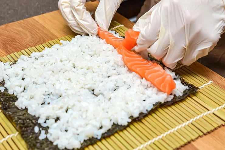 In a big pot boil 4 cups of water, add oil, salt, and whole spices to it. Once the water boils, add washed and drained rice to it. Cook until the rice is done 90% and drain it. Heat oil in a pan and fry the Organic Nation's soya chaap till it's crisp on both sides. In warm milk add saffron strands. Fry the onions, and keep aside a few onions. In the remaining onions add ginger garlic paste and saute for a minute. Now add all spices, salt and tomato puree, cook till oil separates
